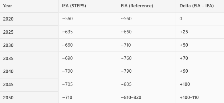 It is important to note; there are numerous institutions that exist with wide differences in projections. Their forecasts vary on policy assumptions, fuel mix changes, efficiency gains, and overall methodology. But I want to include the IEA, as I want to be clear the demand forecast is projected to increase significantly regardless of the forecasting model.