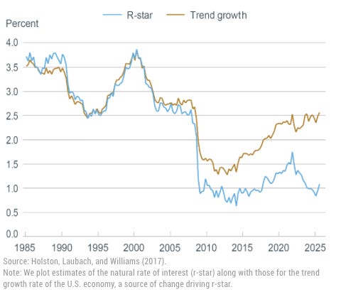 *The natural rate of interest (r*) is the theoretical real (inflation-adjusted) interest rate where the economy is at full employment with stable inflation, acting as a neutral point for monetary policy. In English: the healthy level where the economy can operate and grow without the need for rate hikes or rate cuts from the Fed (i.e. it’s balanced).