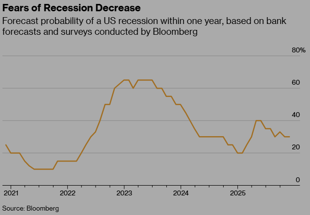 Will we see a recession? after a sharp increase last year after “Liberation Day”, the probability based on forecasts and surveys from Bloomberg have declined to less than 30% chance. (please ignore the dark tint to the graph)