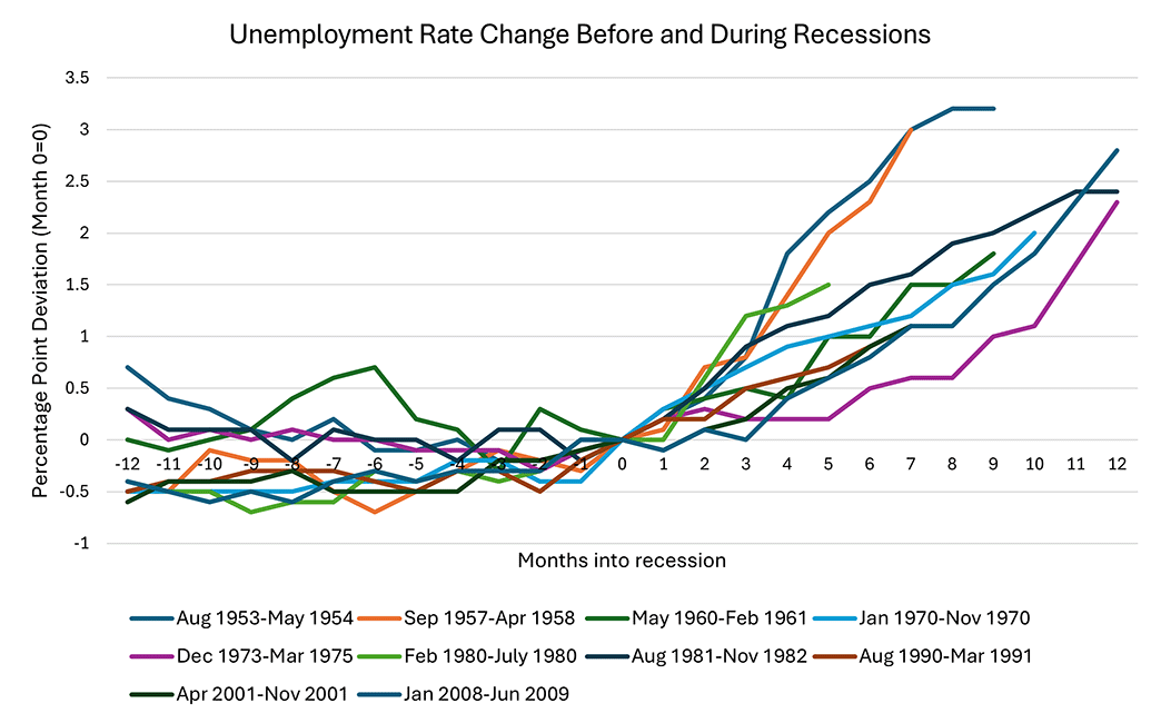 Unemployment tends to “rise gradually, then suddenly” according to data from the Richmond Fed1. They didn’t include the Covid recession (for obvious reasons), but the chart below shows a common theme over the last 11 recessions. Of course, this data assumes we see a recession.